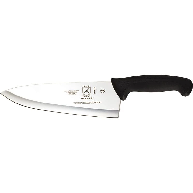 This Mercer Culinary® Millennia® Wide Chef’s Knife is a versatile tool that can be used for dicing, mincing, chopping, and more. It features a high carbon stain-free steel blade, and a comfortable, ergonomic handle.