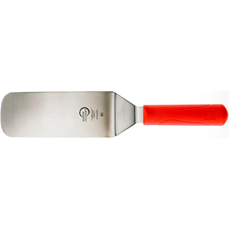 This Mercer Culinary® Millennia® Turner has an 8″ x 3″ blade and is great for grill work in commercial kitchens. It features a molded red handle which provides a sure grip, and helps assist with color-coordinated food safety practices.