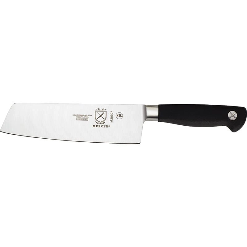 This Mercer Culinary® Genesis® Nakiri Knife is able to slice produce paper-thin. It is made from high carbon German steel and has an ergonomic black Santoprene® handle.