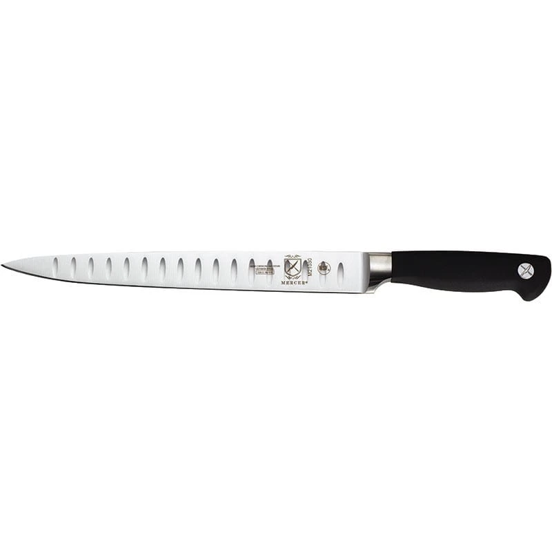This Mercer Culinary® Genesis® Carving Knife can be used to carve or slice meat, poultry, and fish. It is made from high carbon German steel and has an ergonomic black Santoprene® handle.