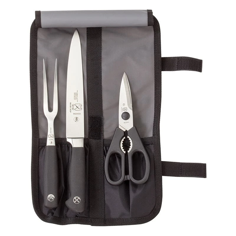 This Mercer Culinary® Genesis® Carving Set includes a carving fork, carving knife, kitchen shears, and a storage roll to hold them all. Each tool is made from high carbon German steel and has a black ergonomic Santoprene® handle. The roll is lightweight and resistant to tears.