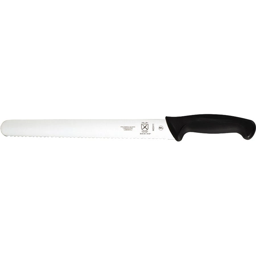 This Mercer Culinary® Millennia® Slicer Knife is an 11″ size and has a wavy edge that is great for cutting soft products with hard crust like bread, or with a tough skin like sausages and tomatoes. It is finished with a black ergonomic handle for comfort during use.