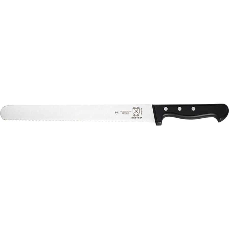 This Mercer Culinary® Renaissance® Slicer Knife easily cuts through products with a hard crust or tough skin. It features a serrated German steel blade and an ergonomic handle. A rounded spine ensures a comfortable grip during use.