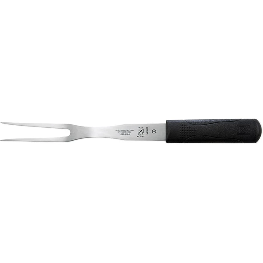 This Mercer Culinary® Millennia® Fork is great for holding food in place while slicing. It is made from high carbon Japanese steel and has a black ergonomic handle for comfort during use.