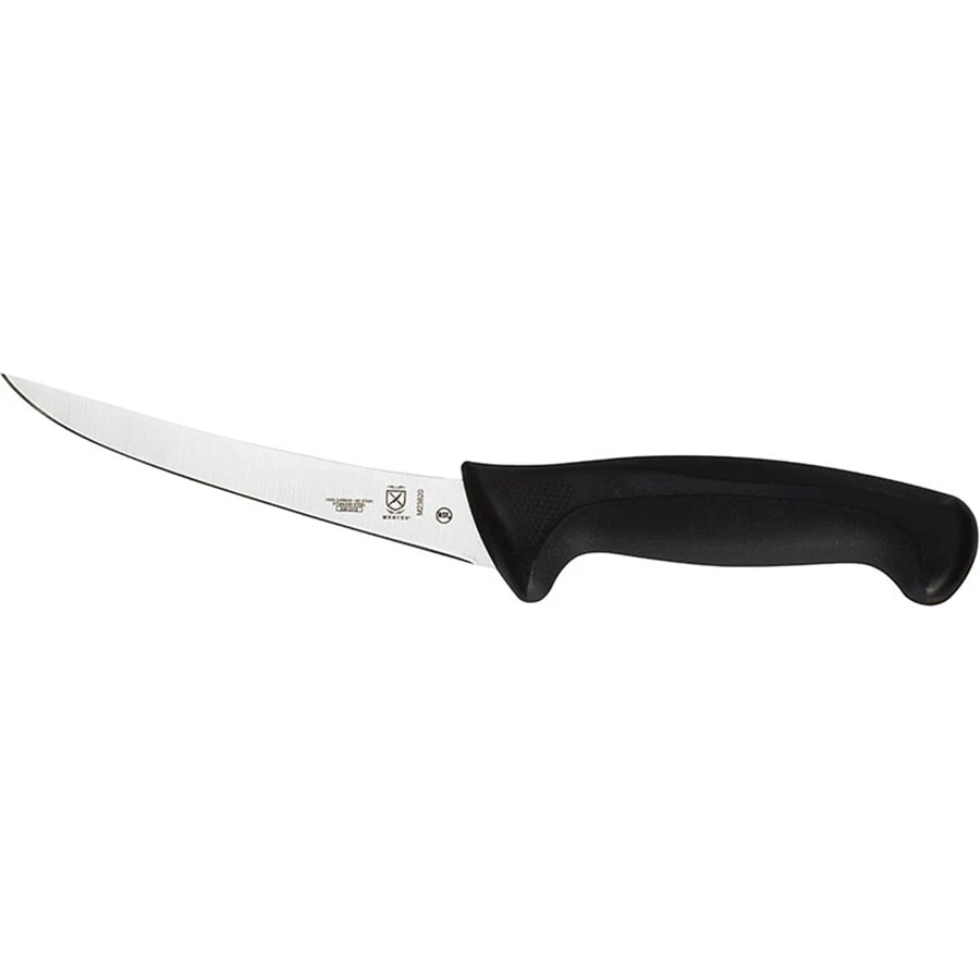 This Mercer Culinary® Millennia® Boning Knife has a curved design and is great for separating meat from the bone and trimming fat and sinew. It is finished with a black ergonomic handle for comfort during use.