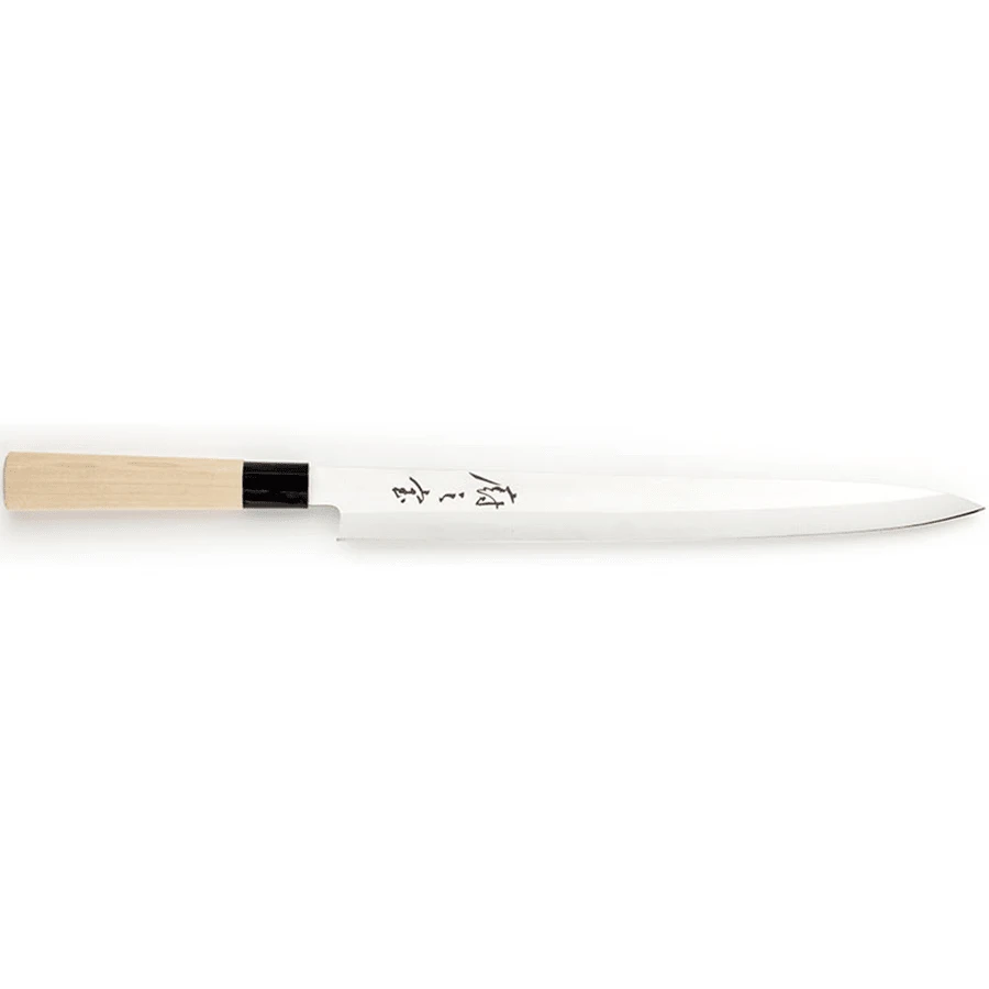 This Mercer Culinary® Asian Collection 12″ Sashimi Knife is great for slicing and cutting large pieces of fish. It is also know as a yanagi or sujihiki knife, and is the equivalent of a western slicer. Its single-blade edge is taper ground and it is finished with a natural balsam wood handle.