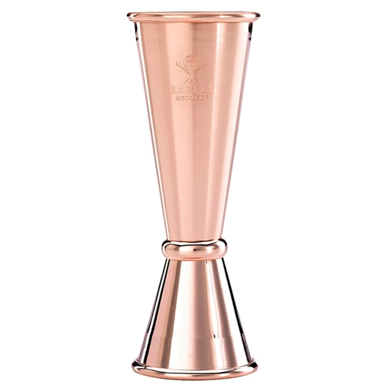 These antique copper Japanese jiggers feature an elongated shape that facilitates smooth and easy pouring. A interior satin finish helps hides wear. The seamless interior design makes it easy to clean.
