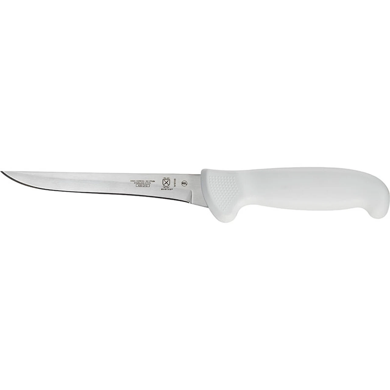 Separate poultry, beef, and other meats from the bone with a simple slice from the Mercer Boning Knife. The ergonomically designed, polypropylene handle of this knife helps you cut comfortably all day, while textured finger points and a protective finger guard provide slip-resistance and a better grip for added safety. The blade is made of stain-free, high carbon Japanese stainless steel that is razor sharp and is designed for long-lasting use.